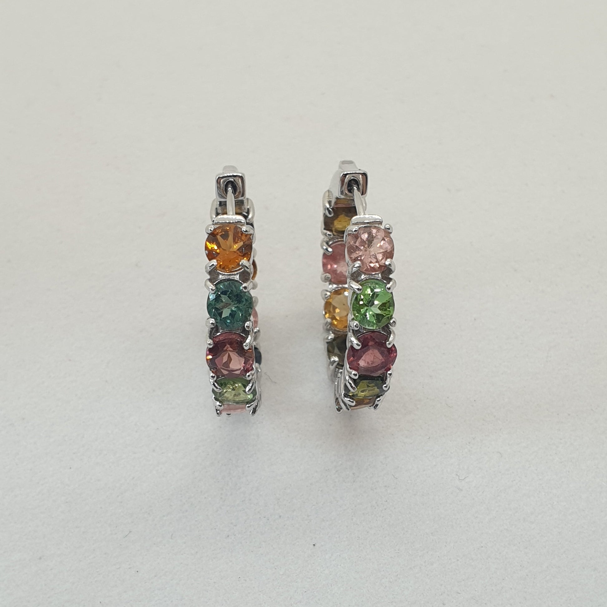 These stunning natural multicolor tourmaline hoop earrings capture the full spectrum of the rainbow in a single, elegant design. Featuring genuine, brilliantly cut Tourmaline in an array of colors, these hoops offer a sophisticated and secure fit for comfortable all-day wear. They're the perfect accessory to add a luxurious pop of vibrant color to any look.