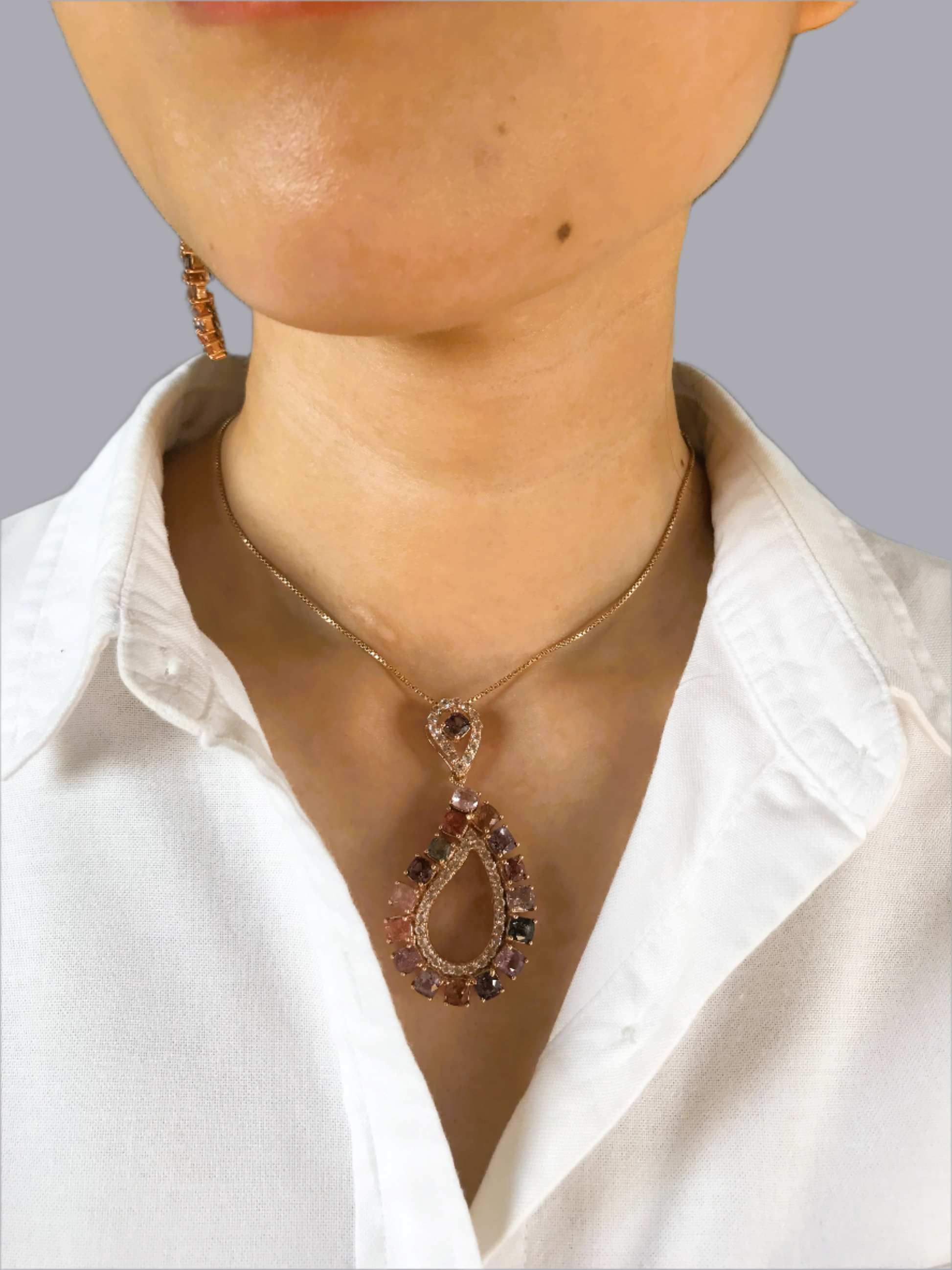 A brilliant fusion of vibrant spinel gemstones and shimmering natural white topaz, this exquisite pendant radiates an enchanting play of colors.