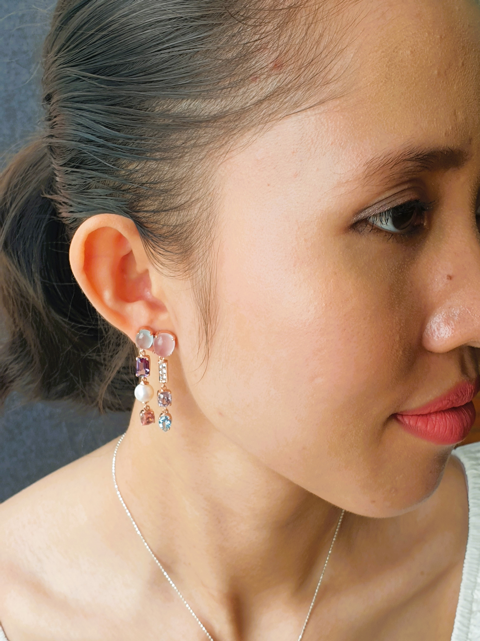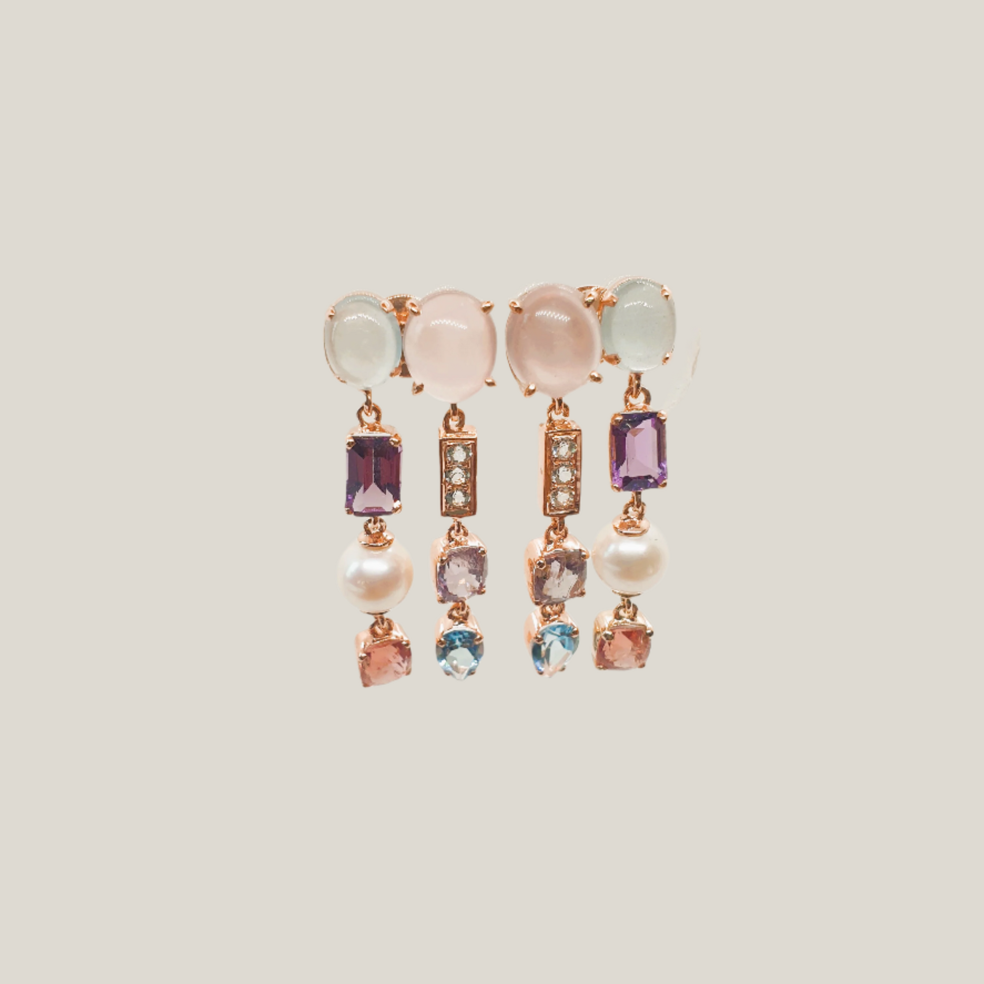 Elegant dangle earrings featuring natural gemstones: Rose Quartz, Aquamarine, Blue Topaz, Amethyst, Spinel, White Topaz, and Freshwater Pearl. Meticulously handcrafted to embody timeless beauty and sophistication.